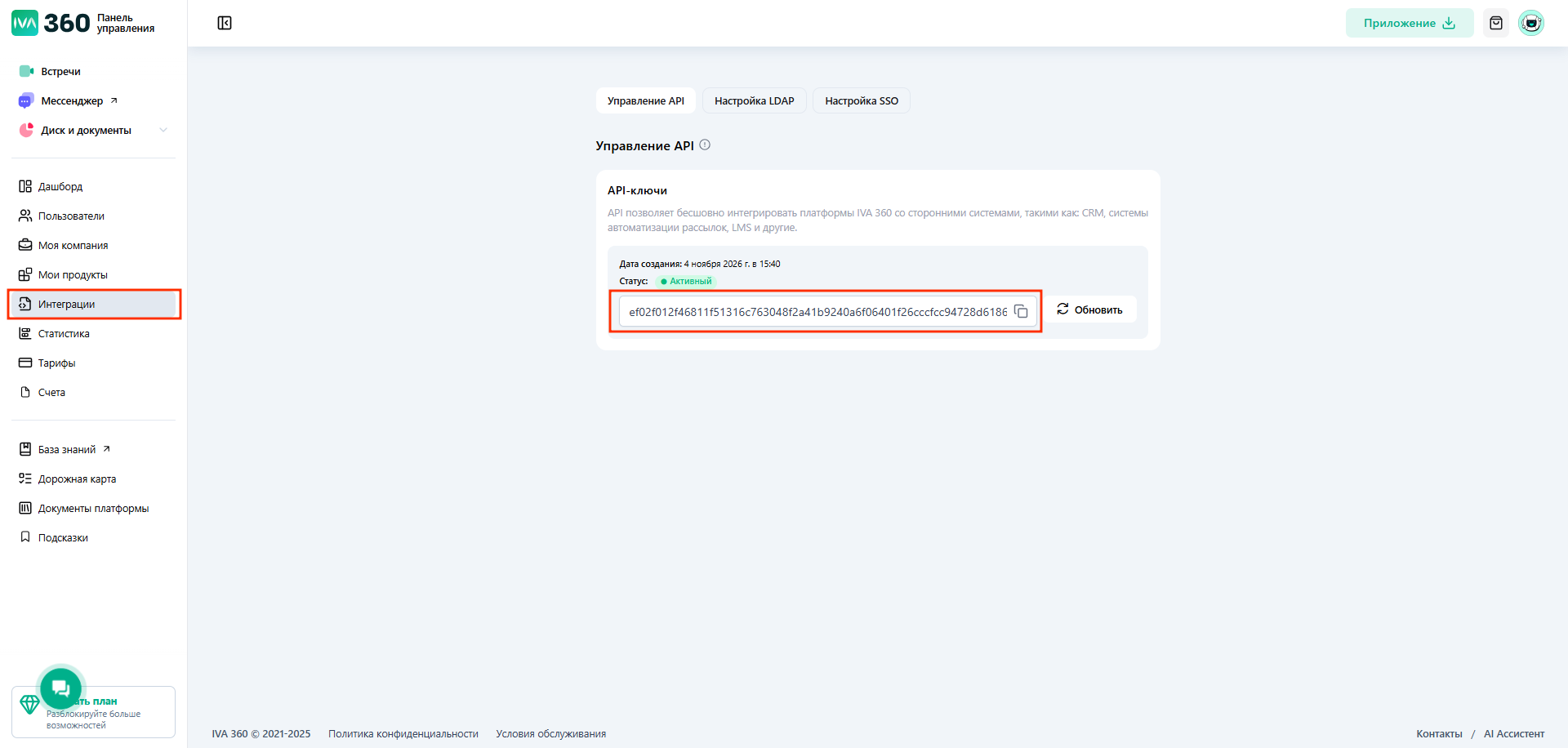 - После этого у Вас появится раздел "Интеграции в личном кабинете (https://lk.iva360.ru/integrations)