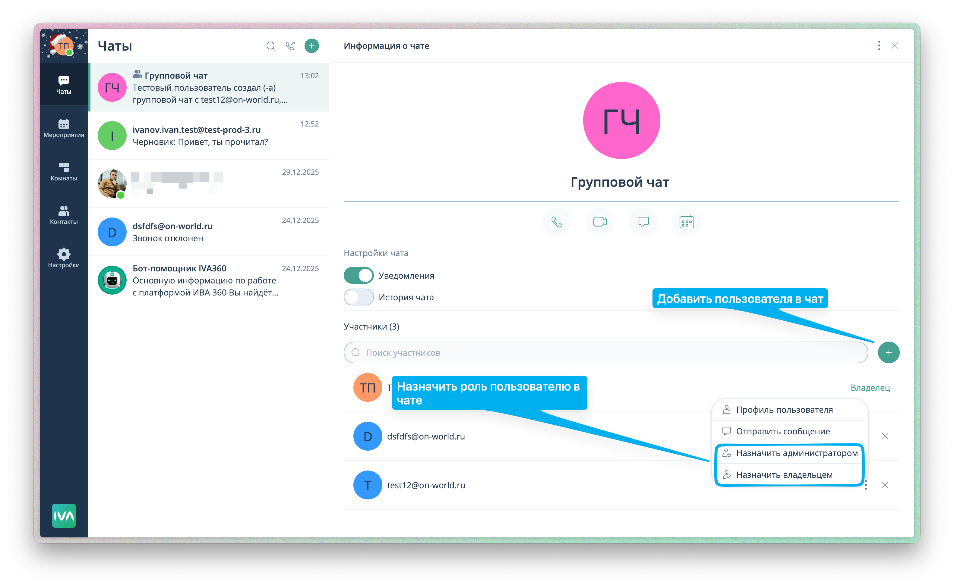 В данной статье вы узнаете о функциях управления групповым чатом и возможностях взаимодействия с участниками на платформе IVA360.