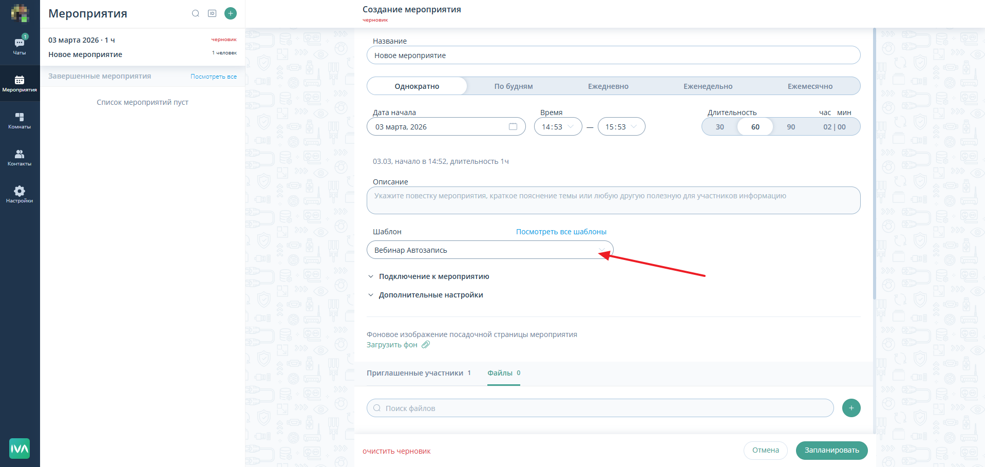 ШАГ 1: При создании мероприятия выберите шаблон мероприятия с припиской “Автозапись”.