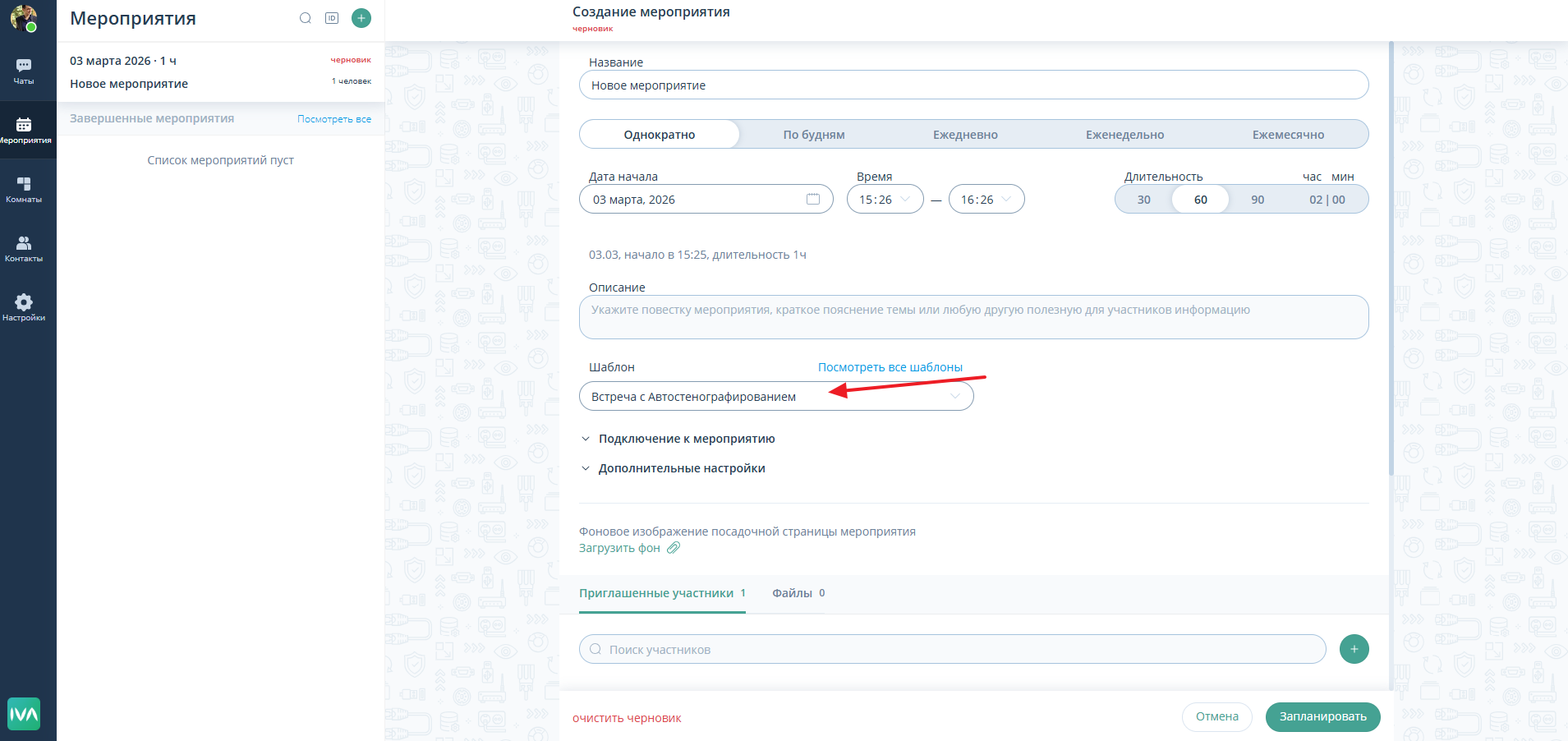 ШАГ 1: При создании мероприятия выберите шаблон мероприятия с припиской “Автостенографирование”.