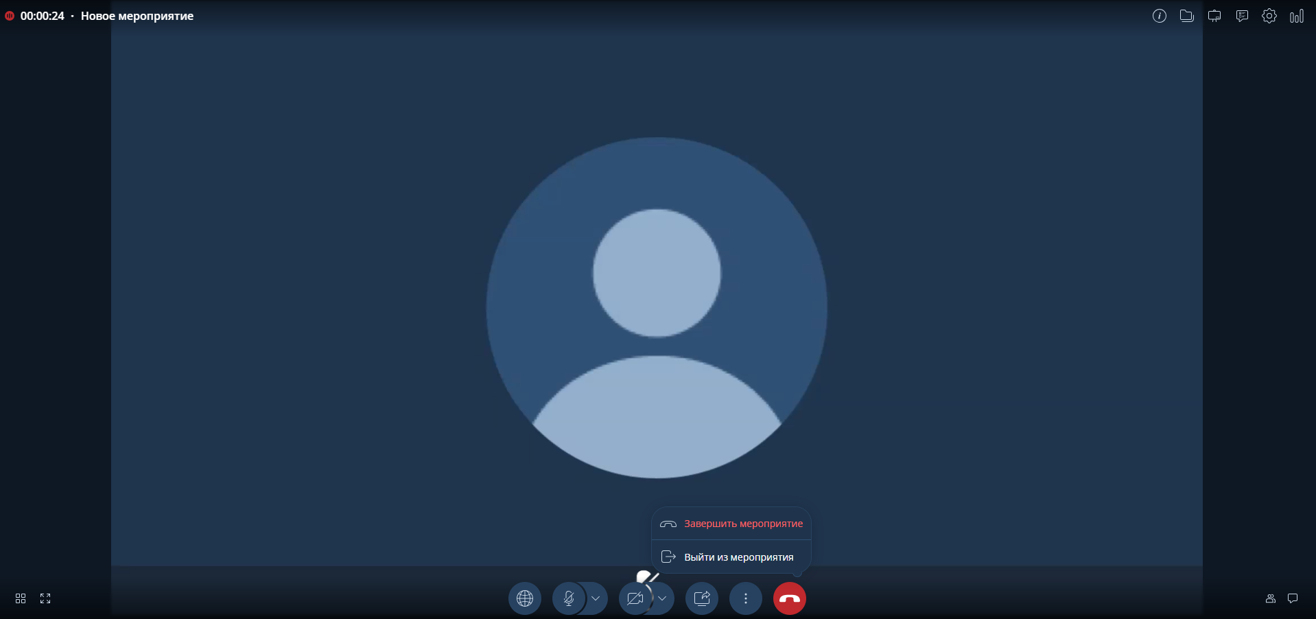 ШАГ 1: На нижней панели управления найдите красную кнопку “Выйти из мероприятия.” ШАГ 2: В появившемся списке кликните на “Завершить мероприятие.”