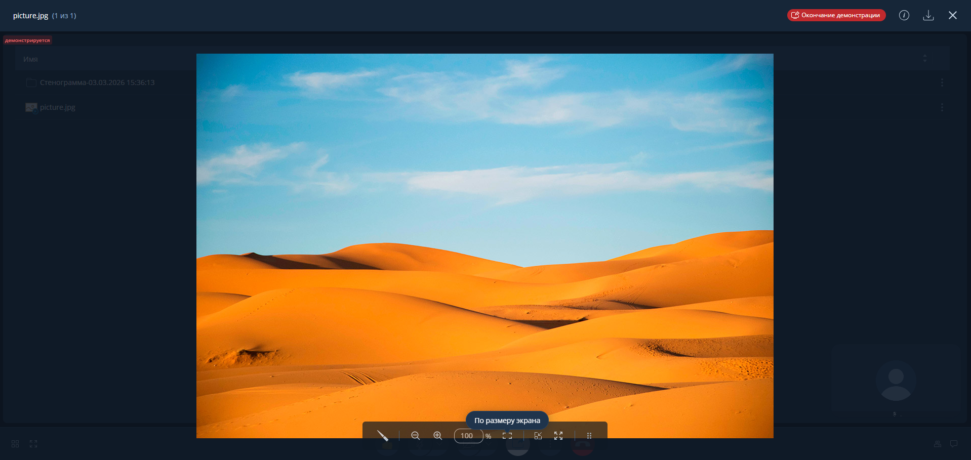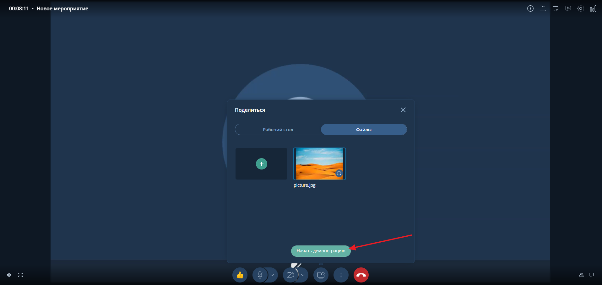 - Нажмите на значок "Демонстрация дополнительного контента" внизу экрана, далее выберите вкладку "Файлы", кликаете на нужный, "Начать демонстрацию".